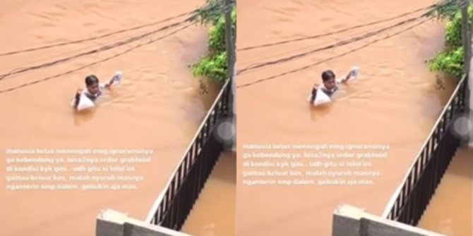 Dengan bersusah payah, ia melangkah perlahan di tengah banjir, sambil membawa pesanan di tangan kanan dan ponselnya di tangan kiri. Ia pun berusaha melindungi pesanan milik customernya dengan menjaga tangannya tetap di atas tanpa terkena air.